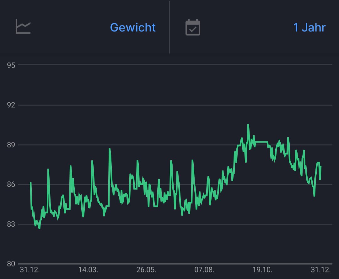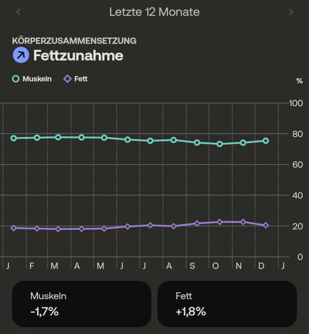 Ich habe mir eine Körperfettwaage von Withings geholt, die sehr interessante Einblicke gewährt. Aber richtig vergleichen kann ich erst nächstes Jahr. Bei der Einrichtung wurde das Geschlecht nicht abgefragt. Im November stellte ich dann fest, dass bei mir weiblich eingestellt war – und ich hatte mich schon gewundert, wieso einzelne Zonen nicht zu meinen Beobachtungen passten.