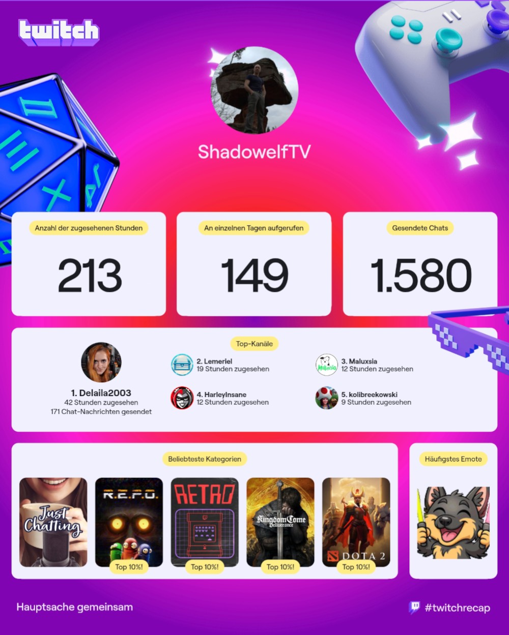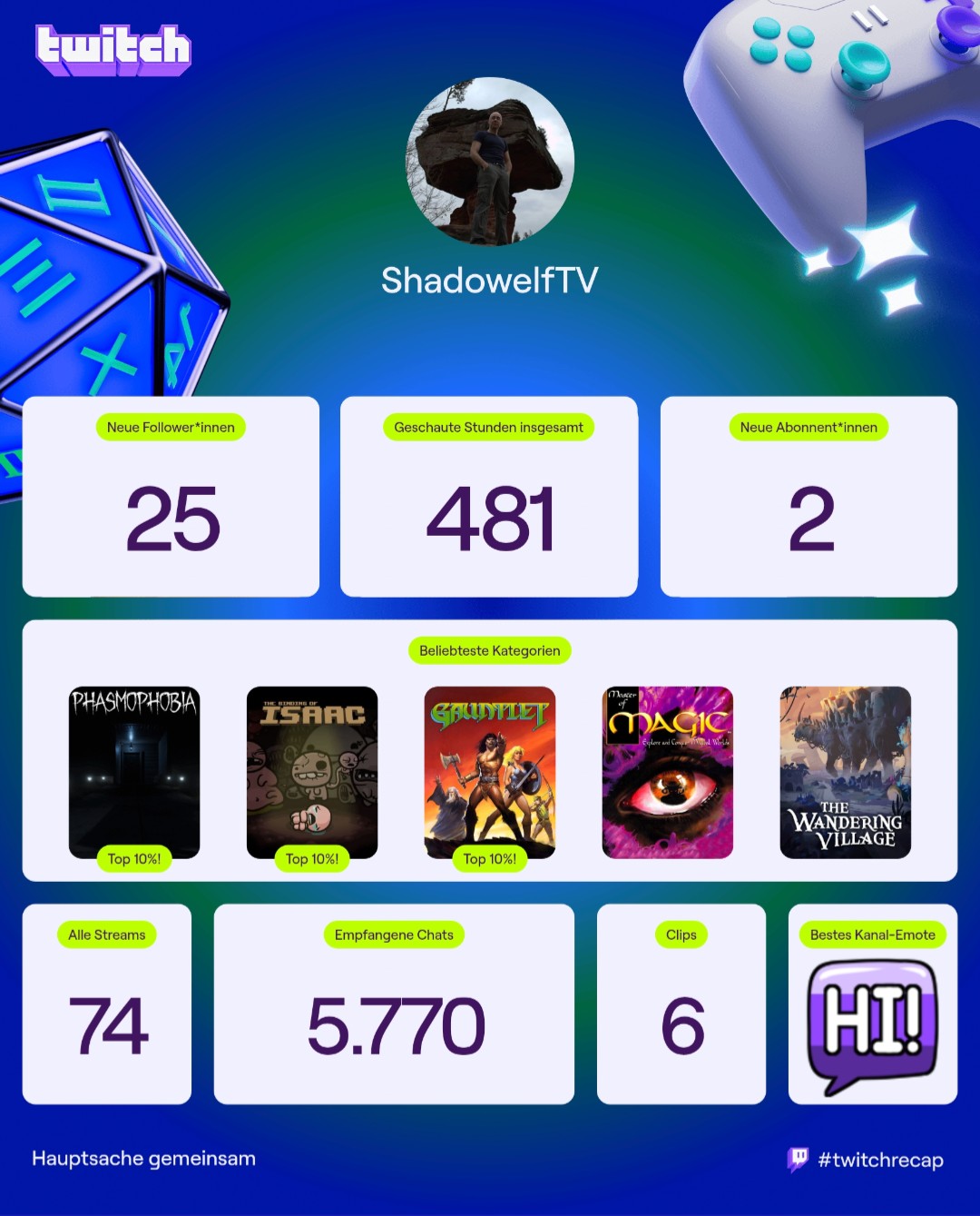 Nachdem ich nun wieder einen neuen Rechner habe, streame und streamte ich auch wieder regelmäßig. Dieses Jahr war es viel Phasmophobia und „The Binding of Isaac“. Neue Spiele werden nächstes Jahr folgen.