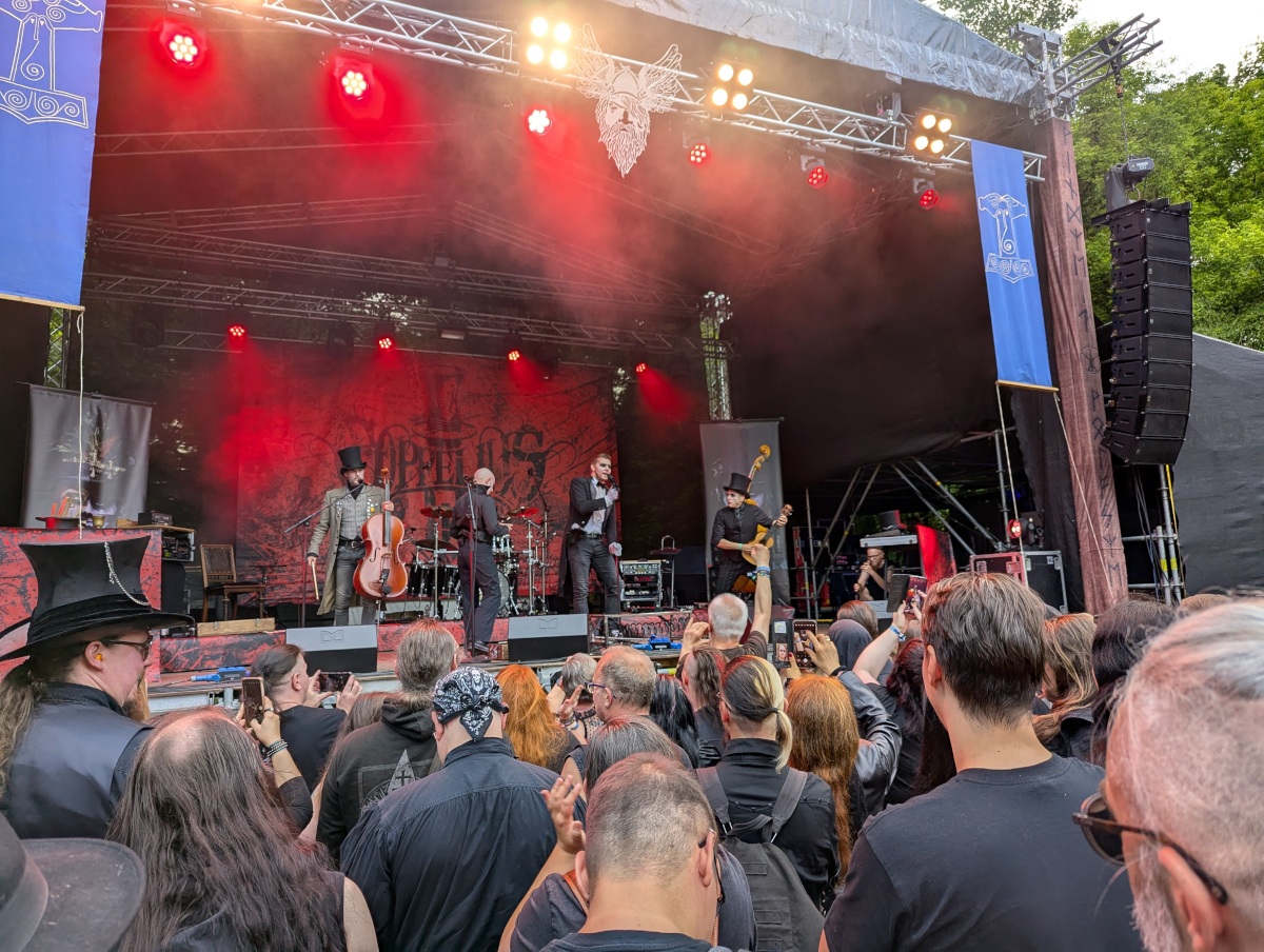 Der WGT-Samstag begann im Heidnischen Dorf mit Totentanz Strumpfsockig, einer Gothic-Mittelalter-Punk-Rock-Band. Ein sehr interessanter Auftritt, auch weil ich so Misch-Genre bisher nicht so oft erlebt habe. Die Mitglieder wurden einzeln begleitet auf die Bühne gebracht, bevor die Seelensammlerin das Konzert eröffnete.